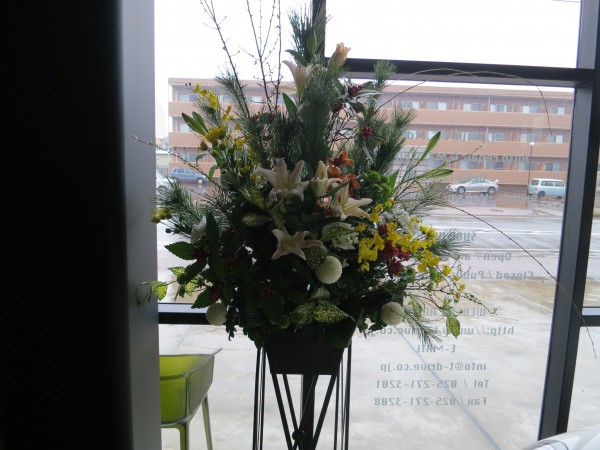 お客様のお花屋さんのlaric bisさんからショールームのお正月飾りを作って頂き